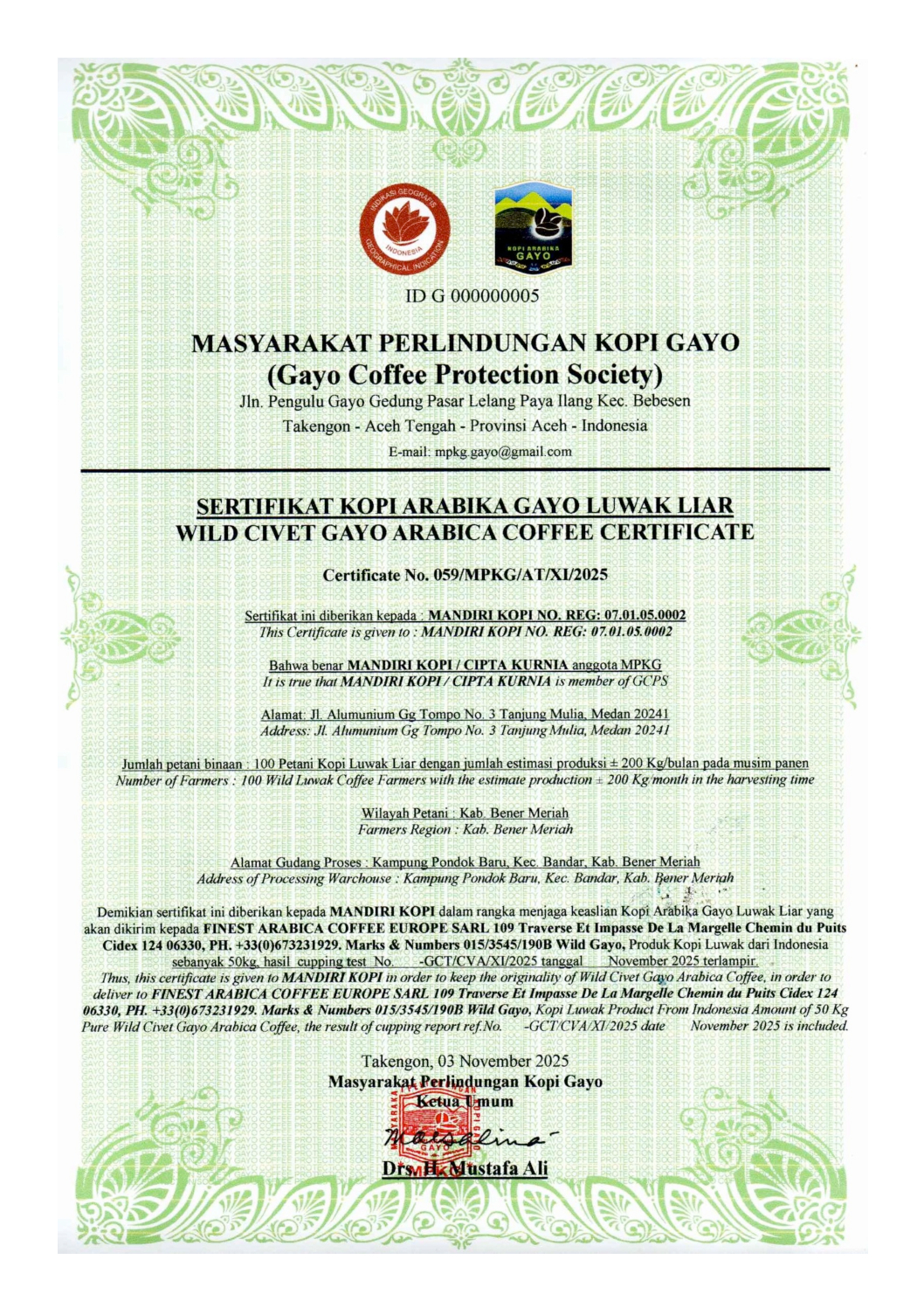 Unlike mass-produced Kopi Luwak, our coffee is certified by the Gayo Coffee Protection Society (MPKG) as wild-sourced Kopi Luwak. For full transparency, the original certification document is available to download.Beans are collected from free-roaming civets and handled by small farming communities in the Gayo Highlands, Sumatra. This ensures authenticity, provenance, and ethical practices.